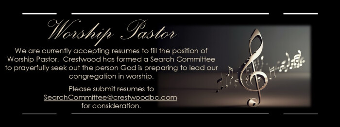 We are currently accepting resumes to fill the position of Worship Pastor. Crestwood has formed a Search Committee to prayerfully seek out the person God is preparing to lead our congregation in worship. For more information about our church, our Worship Service, and the position, click HERE.